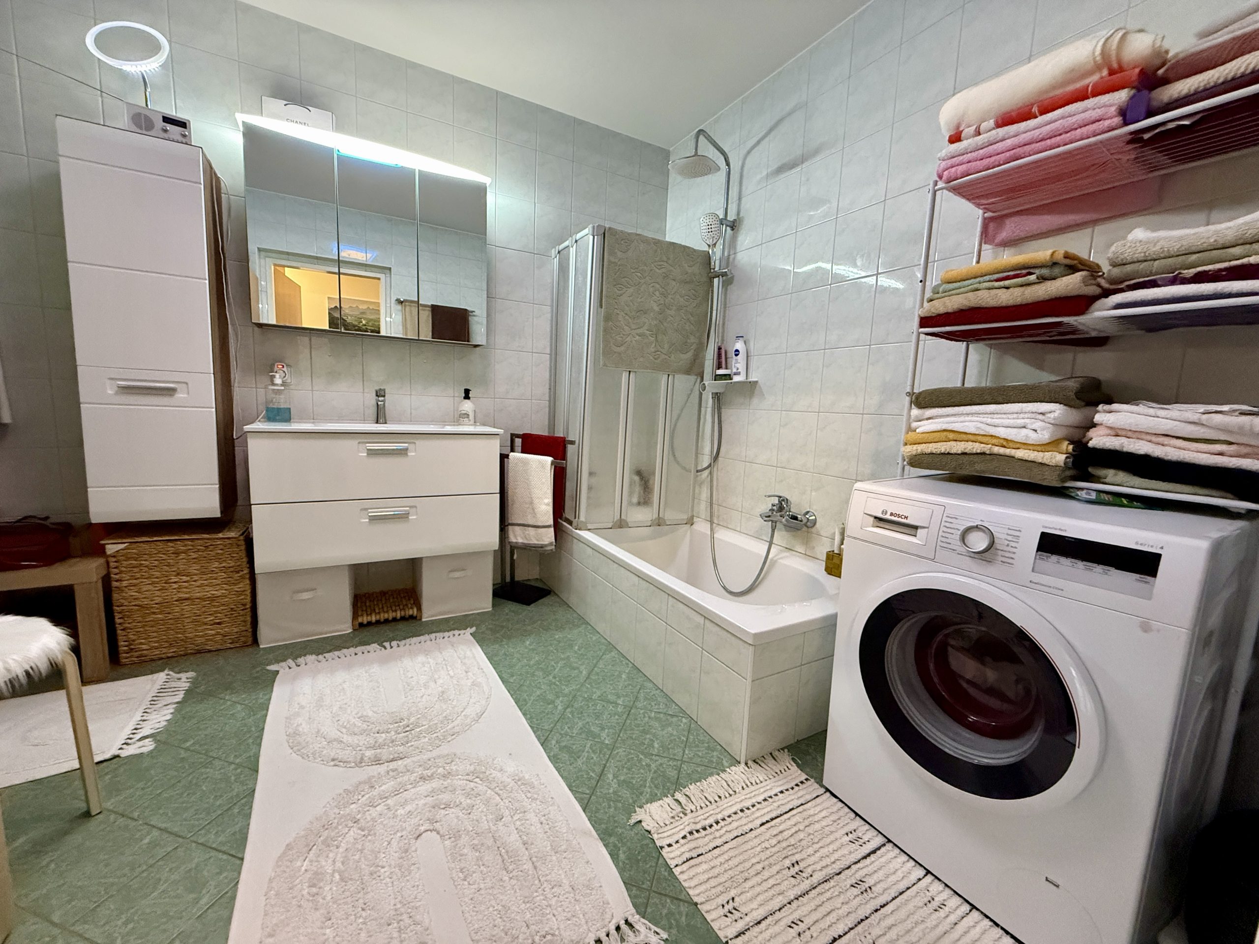 Das stilvolle Badezimmer ist mit einer komfortablen Badewanne ausgestattet – ein idealer Ort für entspannte Momente.