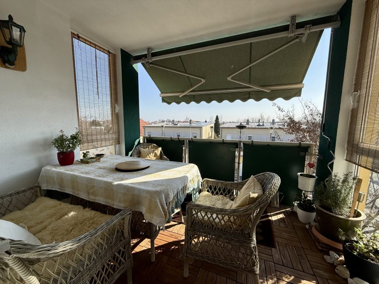 Die überdachte Loggia erweitert den Wohnraum nach draußen. Eine hochwertige Markise sorgt für angenehmen Sonnenschutz und verwandelt diesen Bereich in einen behaglichen Rückzugsort im Freien.