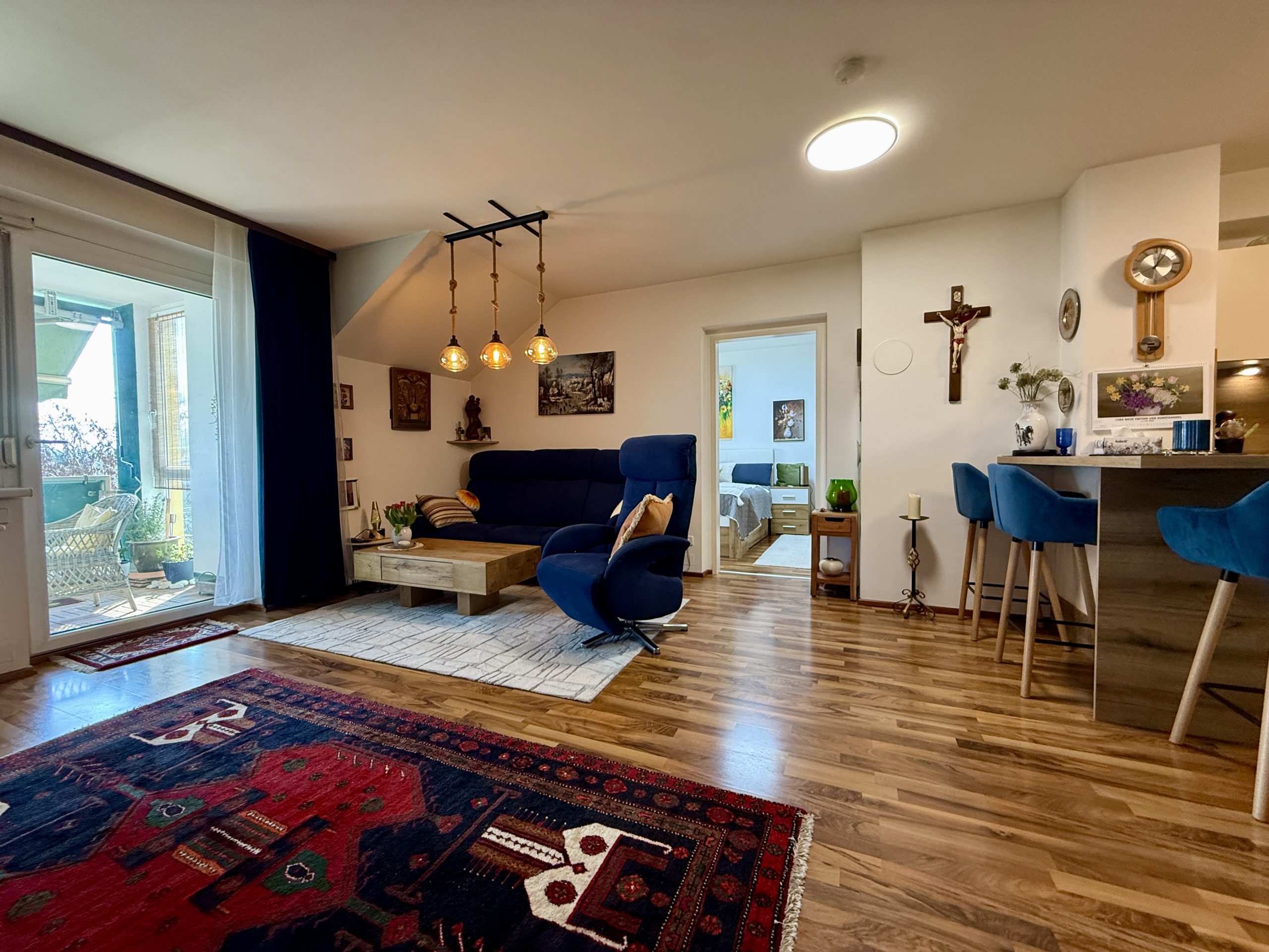 Der helle Wohn-Essbereich bildet das Herzstück der Wohnung. Die offene Küche fügt sich harmonisch ein und große Fensterfronten sorgen für ein freundliches, einladendes Wohngefühl.