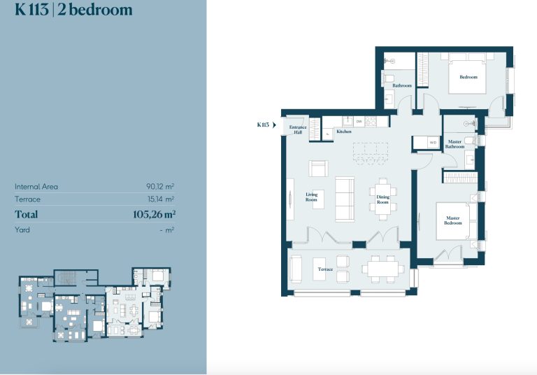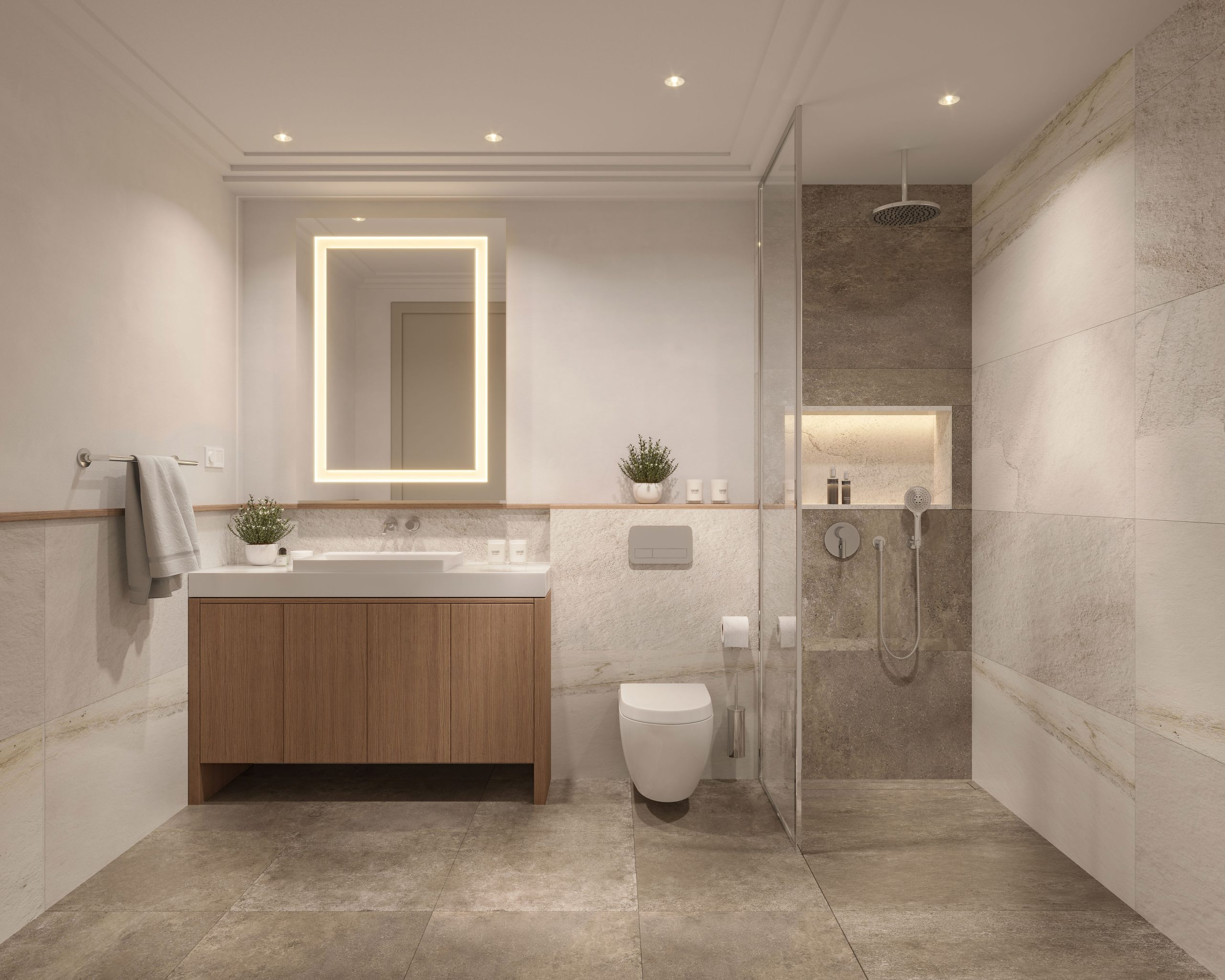 Schlafbereich: Die Wohnung verfügt über zwei Schlafzimmer, wovon der Masterbedroom mit einem eigenen luxuriösen Badezimmer ausgestattet ist. Hier erwartet Sie ein exklusiver Rückzugsort, der durch hochwertige Materialien und eine durchdachte Raumgestaltung besticht. Das zweite Schlafzimmer bietet ausreichend Platz für Gäste oder kann als Büro genutzt werden. Ein weiteres Badezimmer steht für Komfort und Privatsphäre zur Verfügung.