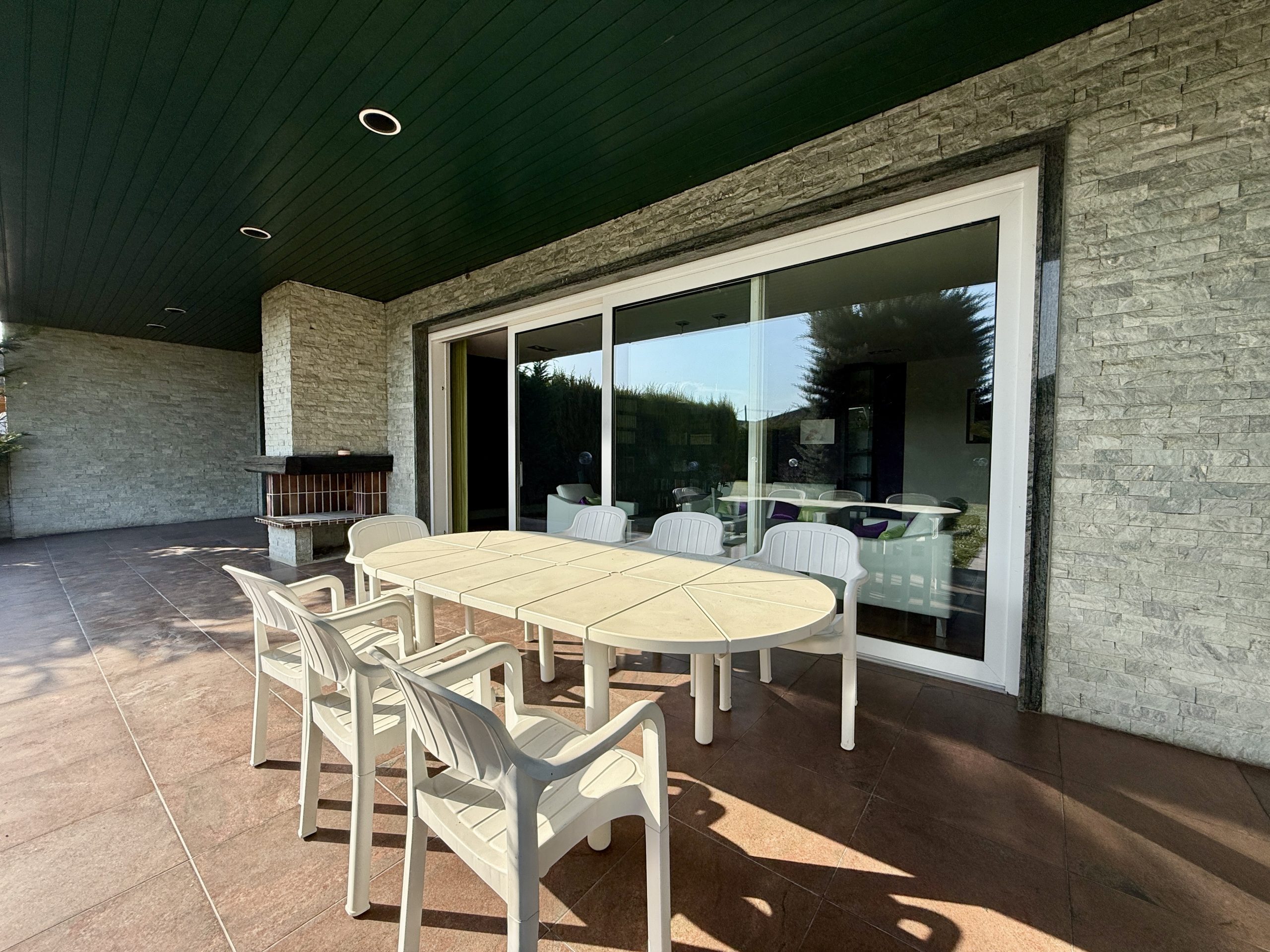 Die große, überdachte Terrasse mit offenem Kamin lädt ganzjährig zu entspannten Stunden ein – perfekt für gemütliche Abende im Freien.