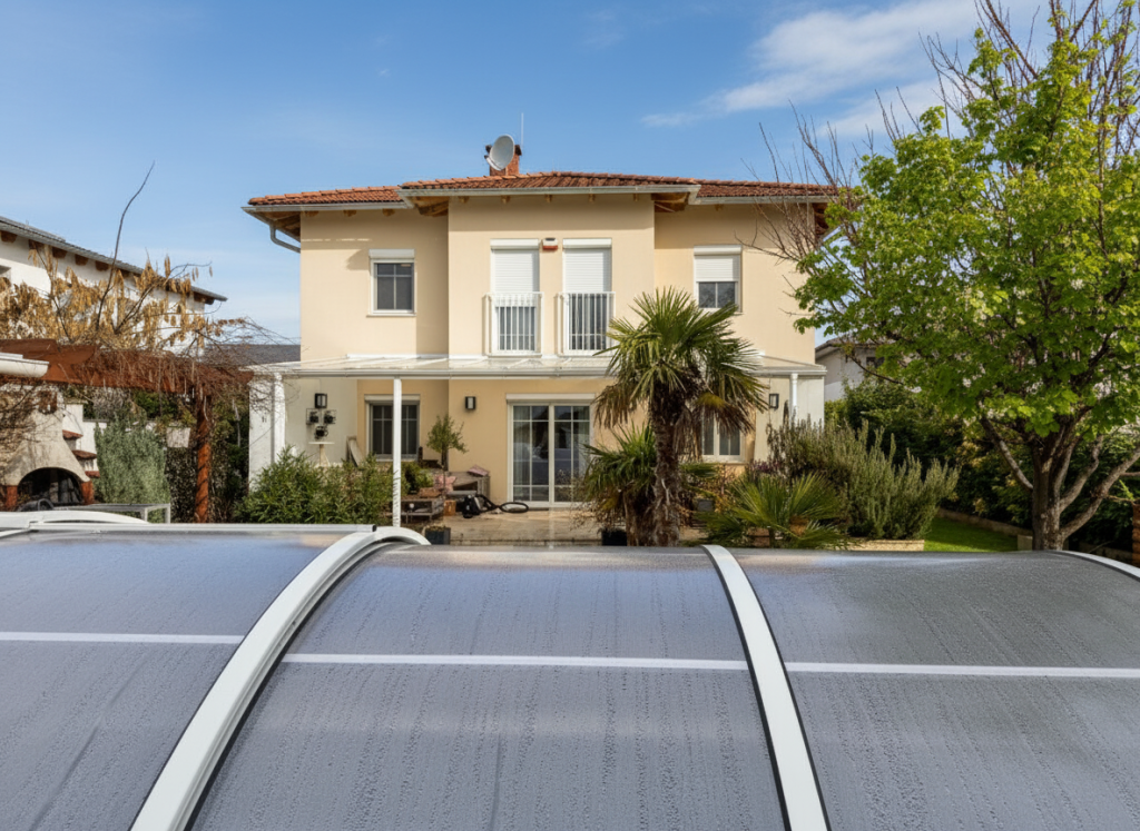 Der Außenbereich wurde im Jahr 2020 vollständig neu gestaltet. Der liebevoll angelegte Garten lädt zum Entspannen ein und wird durch ein modernes Pool ergänzt, das wahlweise mit Salz- oder Chlorwasser betrieben werden kann. Die Pooltechnik ist praktisch in einem separaten Technikraum beim Carport untergebracht und leicht zugänglich. Ebenfalls 2020 wurden die überdachte Terrasse sowie das Carport neu errichtet.