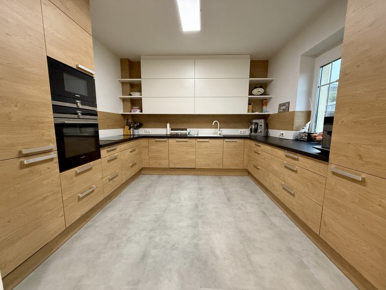 Bereits der großzügige Eingangsbereich vermittelt ein angenehmes Wohngefühl. Im Erdgeschoss befinden sich ein Gäste-WC sowie der helle Wohn- und Essbereich mit direktem Ausgang auf die überdachte Terrasse und in den Garten. Die offene Wohnküche fügt sich harmonisch in den Wohnbereich ein und bietet viel Platz für gemeinsames Kochen und Wohnen.